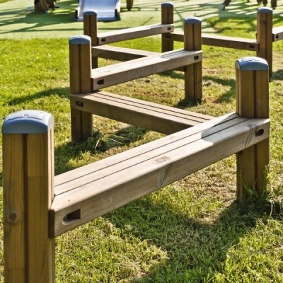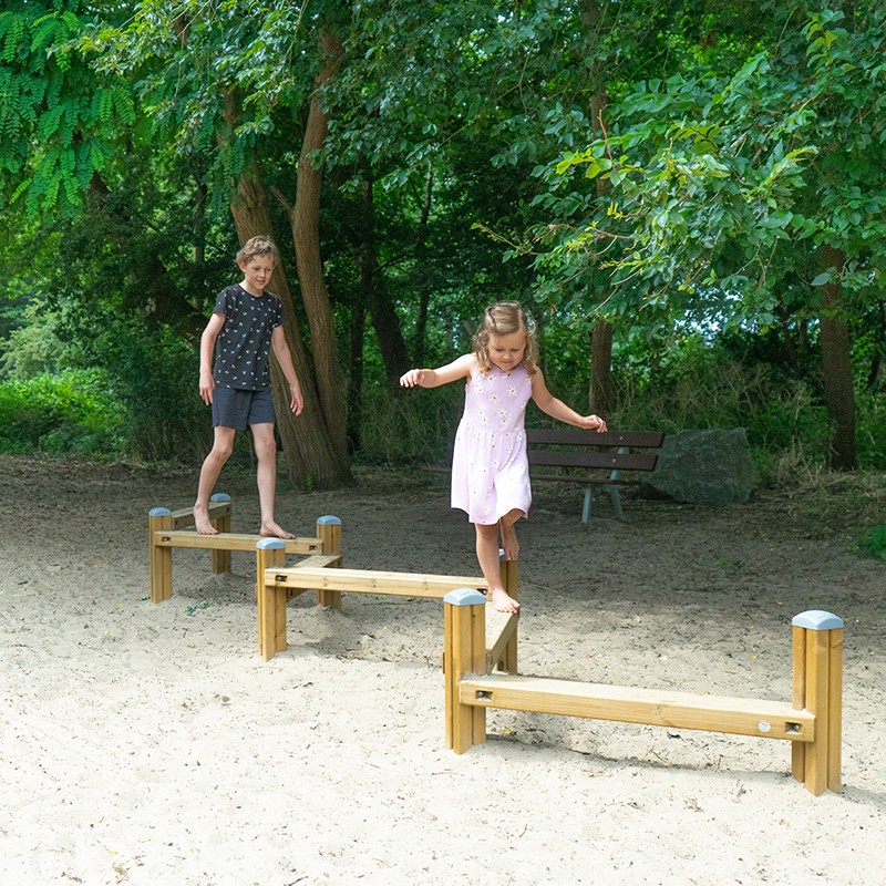 De natuurlijke speeltoestellen van Clover bieden veel speelwaarde, hebben vrijwel geen scheurvorming en blijven langdurig mooi. Door hun neutrale uitstraling zijn ze perfect geschikt voor alle omgevingen. Deze evenwichtsbalk gaat niet rechtdoor, maar zig-zagt. De hoogte van de balken is verschillend.