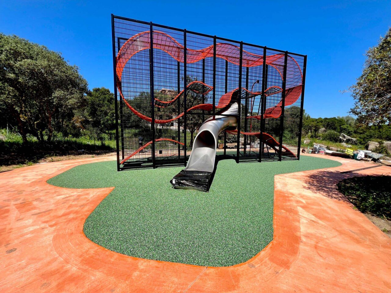 Alsof een gigantisch klimparadijs nog niet genoeg was, heeft het ook nog meerdere mogelijkheden tot uitbreiding met: glijbanen, brandweerglijpalen waaraan je met een licht draaiende beweging langzaam naar beneden zweeft of een doel in het midden voor bij een trapveldje.