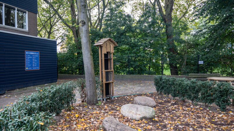 Naast actieve speelplekken is er veel aandacht voor natuur en beleving. Er is een buitenlesplaats ingericht met struiken, grote keien en boomstammen. In plantenbakken gaan leerlingen zelf groenten, kruiden en bloemen kweken. Een insectenhotel verrijkt de groene omgeving.