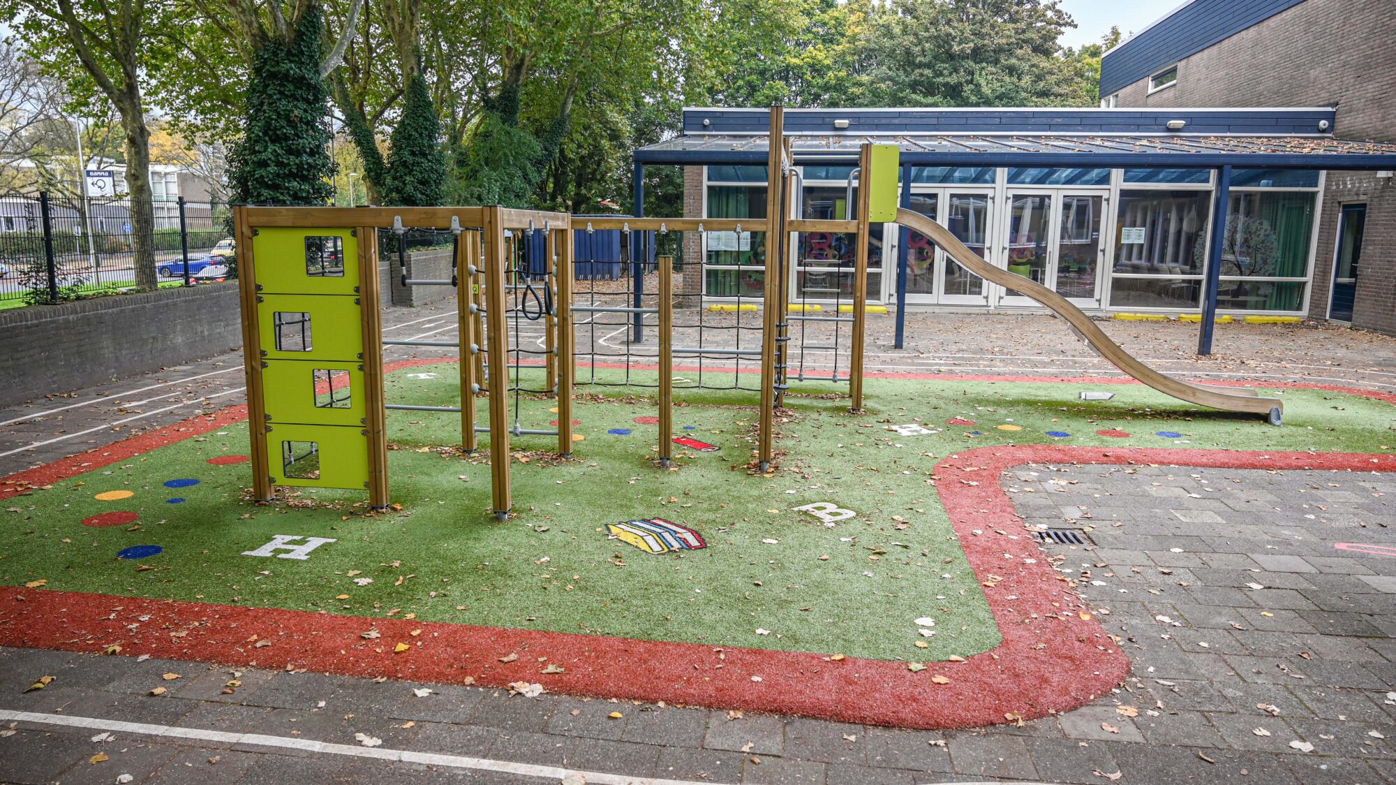 De ondergrond van kunstgras is niet alleen functioneel en veilig, maar ook educatief ingezet. Letters in het gras nodigen uit tot taalspel tijdens de pauze. Zo wordt bewegen gekoppeld aan leren en krijgt taalontwikkeling ook buiten het klaslokaal een vanzelfsprekende plek.