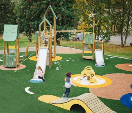 Konttinen Park is ontworpen als één geheel. Niet alleen een reeks speelplekken, maar een doorlopende ervaring. Kunstgras en toegankelijke paden zorgen voor soepele beweging voor rolstoelgebruikers en kinderwagens. De verschillende zones zijn goed bereikbaar en duidelijk met elkaar verbonden, zodat elk kind zijn eigen weg naar spel kan vinden.