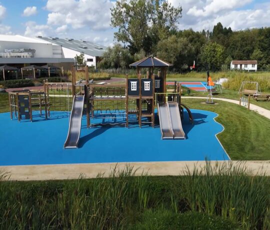 Tijdens de uitwerking bleek een groot deel van het park in een overstromingsgevoelig gebied te liggen. Dat vroeg om een doordachte en realistische aanpak. De ondergrond vormt daarbij een cruciale factor. Er is gekozen voor 2 soorten gietrubberen valdempende ondergrond van Proxy Fields. Dankzij de waterdoorlatende structuur kan regenwater, zelfs bij intense stortbuien, vlot infiltreren. Via subtiele taluds en natuurlijke afstromingen wordt het water richting beken geleid.