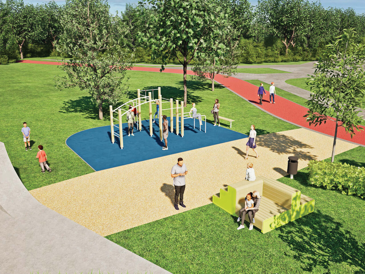 Aansluitend op het bestaande skatepark is een outdoor fitness- en calisthenicszone geïntegreerd met de Calisthenics Street Workout L in de Natural kleur en tafeltennistafel. Hier vinden urban sporters een laagdrempelige plek om te trainen. Dankzij de chillout banken en Scandinavia Parkbank wordt de ontmoetingsfunctie van de plek versterkt.