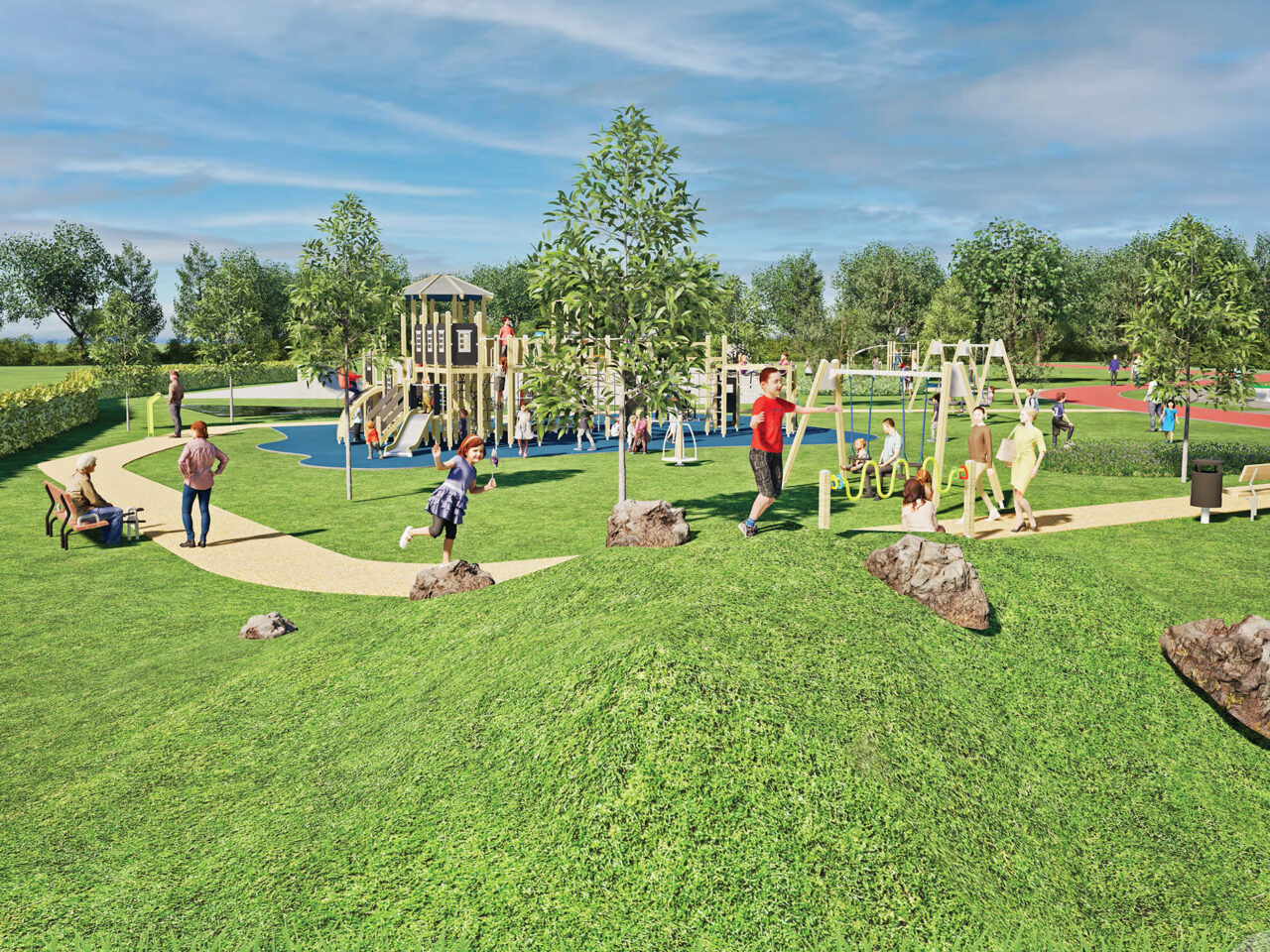 Het hart van het park is een ruime en inclusieve speeltuin. Hier hebben we geplaatst: Schommel voor 2 met Vogelnest, Schommel voor 2 Laag, Rolstoeldraaimolen Wildlife, Actief Spelen met Klimnest, Zigzagstang en Draaitol. De toestellen zijn zo gekozen dat ze toegankelijk zijn voor kinderen met een beperking én voldoende uitdaging bieden voor kinderen zonder beperking. Terwijl de (groot)ouders toekijken kunnen ook zij in beweging komen, dankzij de Voetfiets en Handfiets die geplaatst zijn bij de banken rondom de speelplek.