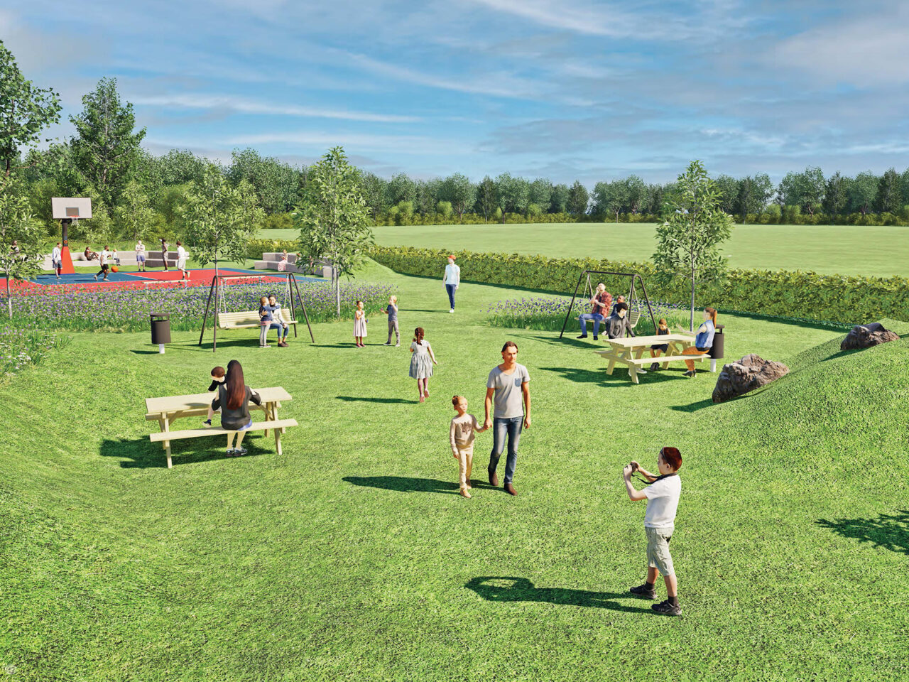 Een deel van het terrein is bewust vrijgehouden. Deze open ruimte biedt plaats voor picknickbanken, het natuurlijke karakter van de plek én biedt voldoende ruimte voor afwatering tijdens natte perioden.