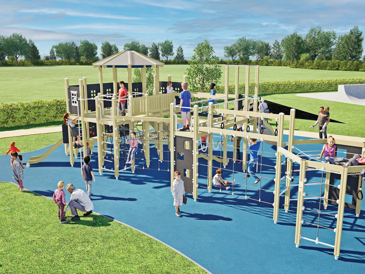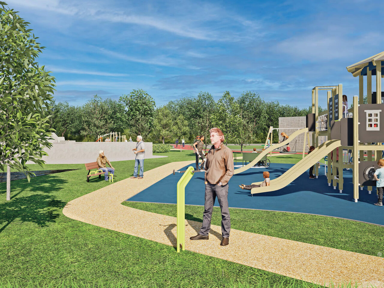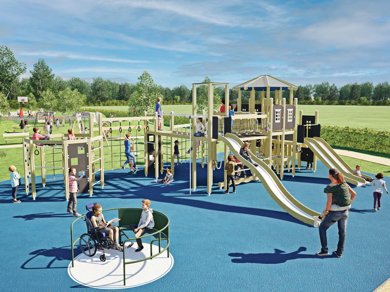 In de inclusieve speeltuin kunnen kinderen samen spelen op de rolstoeldraaimolen, draaitol, schommelbank en het grote klimtoestel. Terwijl de kinderen spelen worden ook de (groot)ouders actief uitgedaagd op de voetfiets en zigzagstang. De speelplek is overzichtelijk en sociaal: gezinnen blijven langer, grootouders kunnen comfortabel op de banken zitten en toch dicht bij de kinderen blijven.