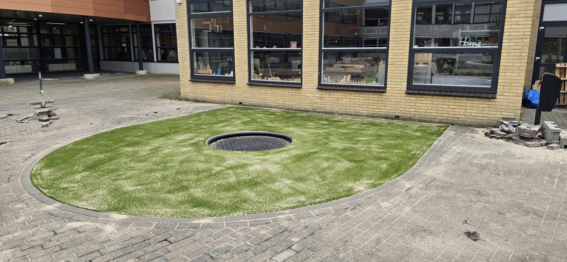 Op vrijdag 3 maart 2025 was de geweldige oplevering bij VSO de Stormvogel in Hoorn. Het doel van Kristin, de directeur: “Onze leerlingen hebben een verstandelijke beperking. Zij verdienen het om te bewegen en plezier te kunnen maken op een plein dat bij hun behoeftes past. Ik wilde hen het mooiste middelbare schoolplein van Hoorn geven, en dat is gelukt!”