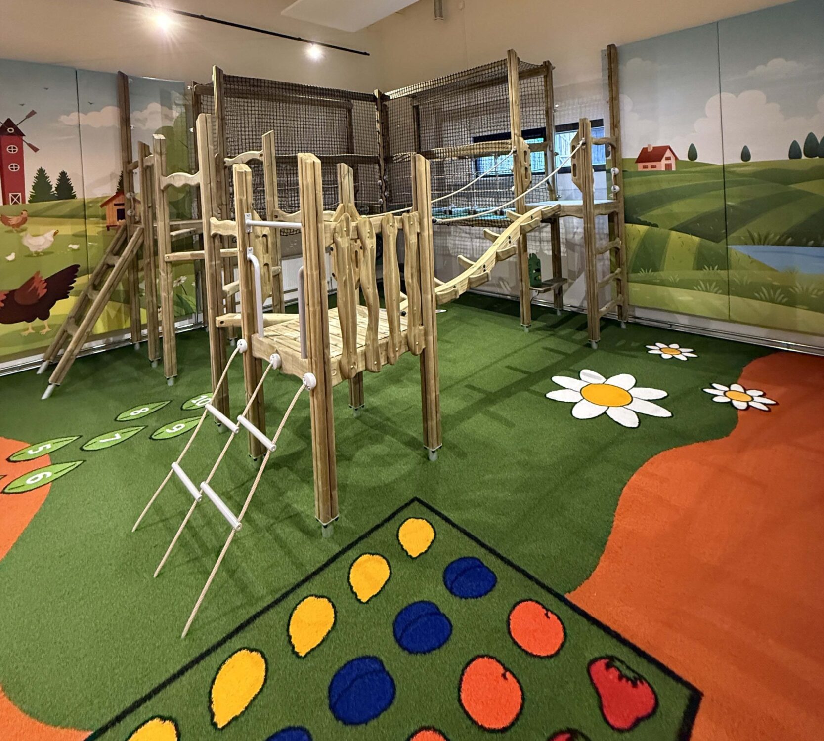 - Gethematiseerde valondergrond en wanden – de vloer is niet alleen veilig, maar heeft ook een speelfunctie die kinderen uitnodigt tot spelen, wandillustraties van een boerderijlandschap creëren een speelse omgeving die de fantasie prikkelt